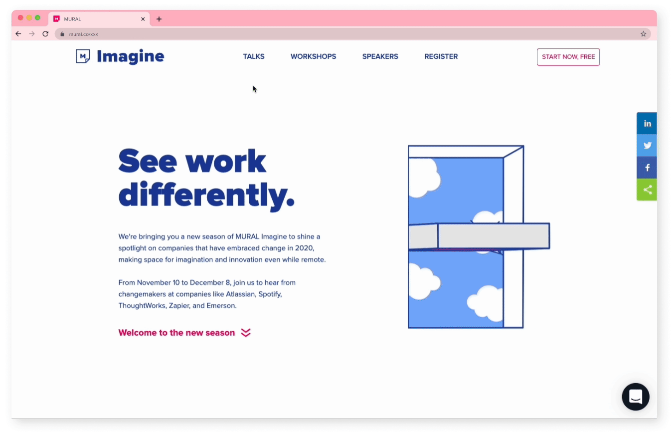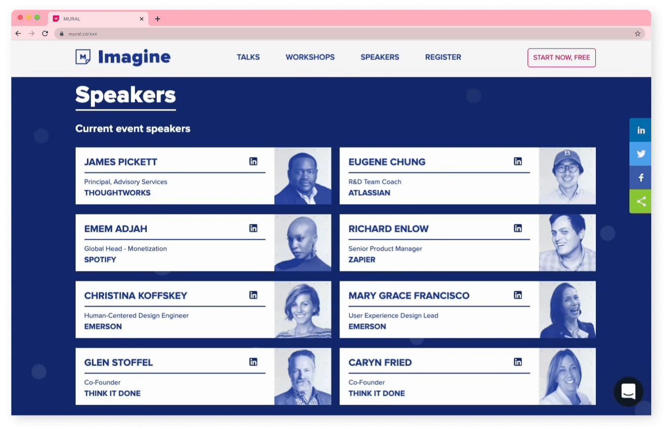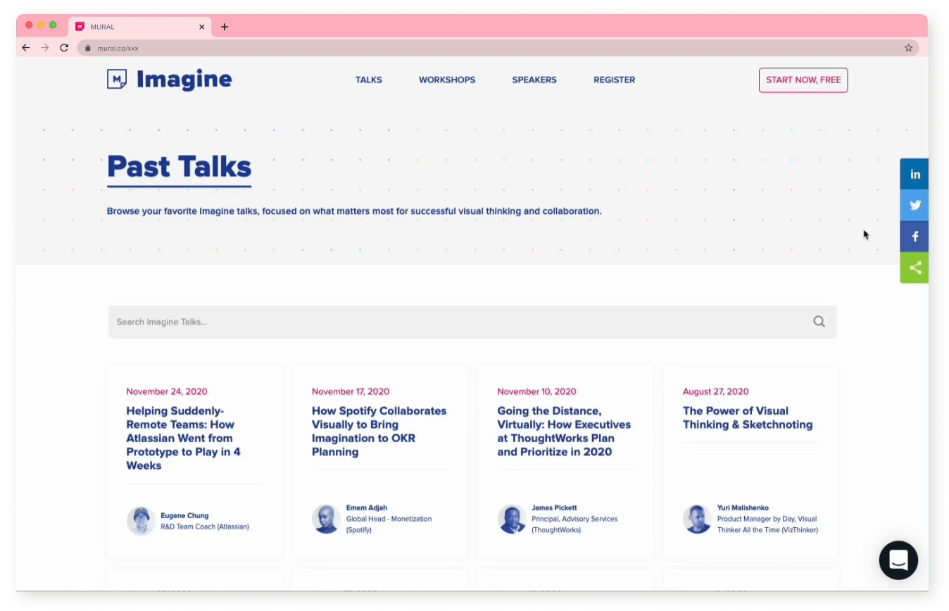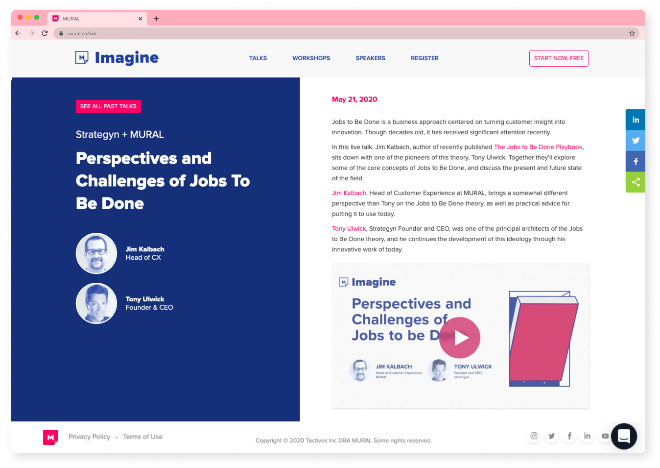 Mural Imagine was a virtual event series bringing together the world's leading minds to discuss what matters most for successful visual thinking + collaboration during a time when the world just began shifting to remote work. It consisted of various live talks, workshops, and recorded sessions that attendees could watch on-demand.