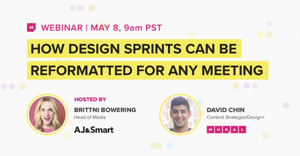 Mural partnered with design sprint experts AJ&Smart to share how you can reformat the design sprint process to help you run the best meetings and workshops of your career, AND get buy-in from your team to adopt this new way of working. Our guest host, Brittni Bowering, walked us through the presentation deck while I moderated and responded to inquiries in the live chat of 500+ global attendees, an integral aspect to the Mural webinars as we encourage engagement from the audience throughout. I then closed us out by moderating the interactive Q&A session where we answered the most upvoted questions asked during the session.